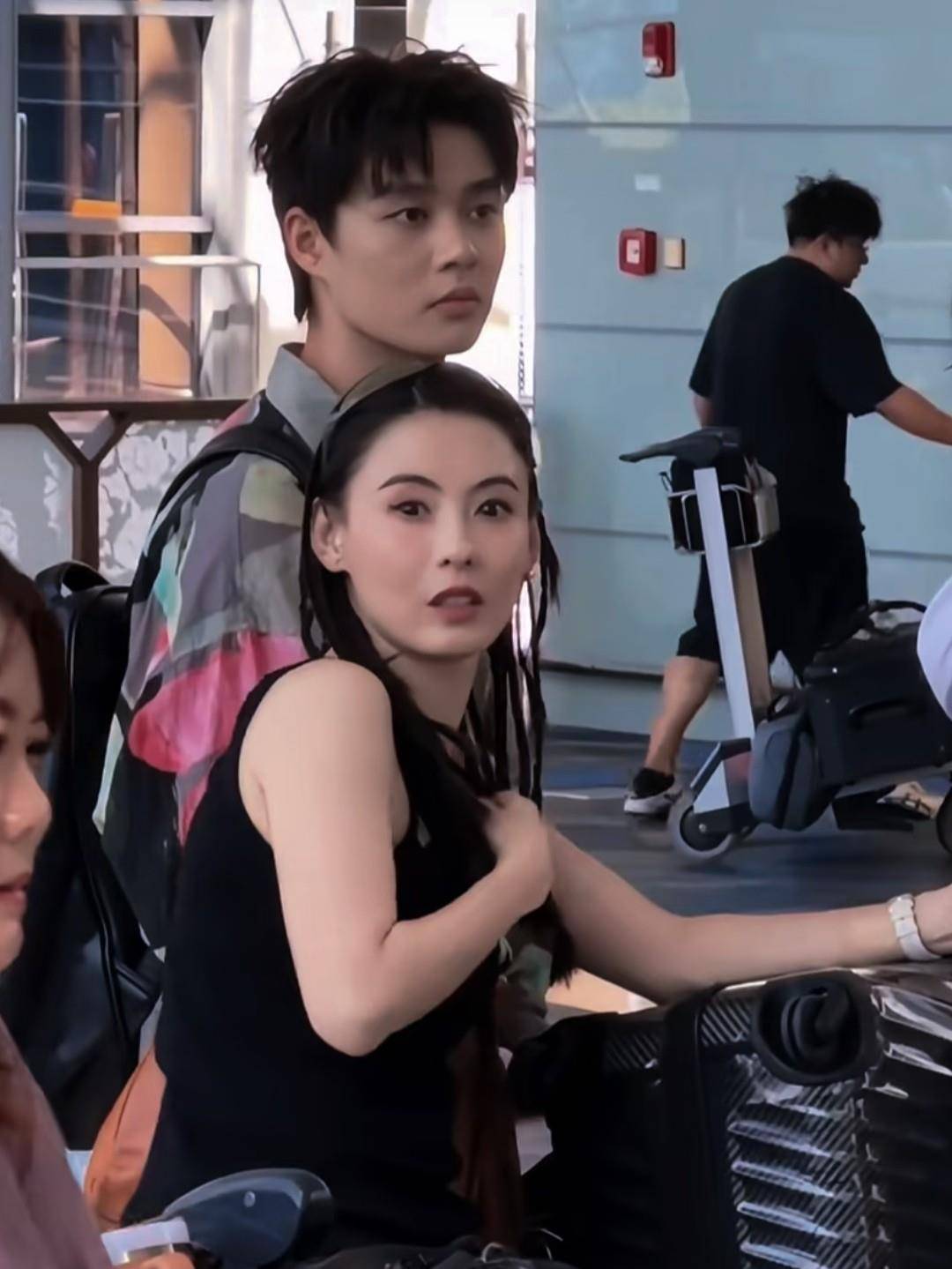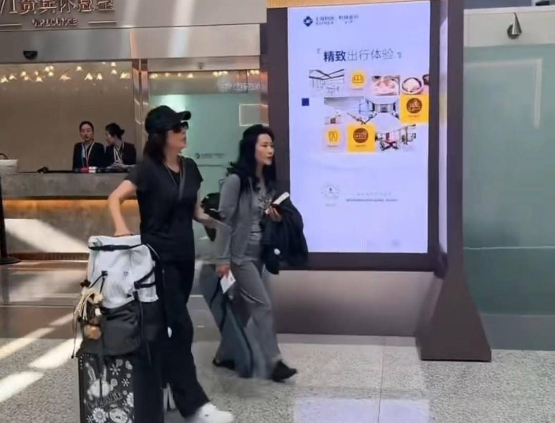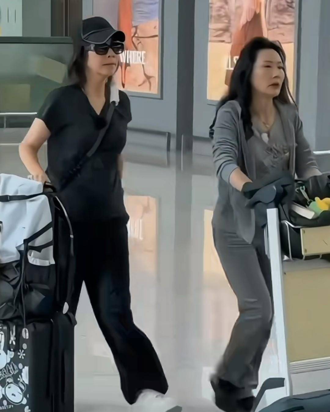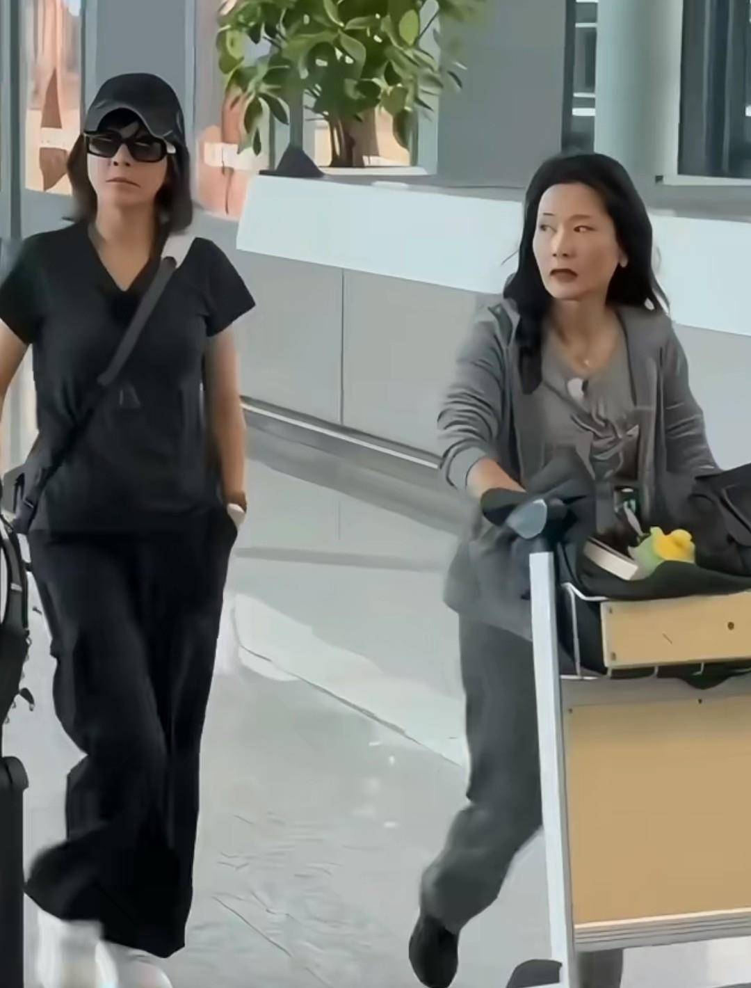在机场,何赛飞和刘嘉玲一起推着行李往前走。刘嘉玲穿着黑色运动装,身材苗条,姿态挺拔,一手插兜一手推箱子,戴着墨镜,显得很酷,看起来比实际年龄小很多。